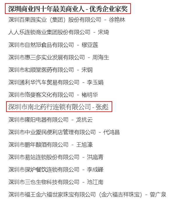 4月23日,由深圳市零售商业行业协会主办的“深圳商业四十年最美商业人”评选结果正式揭晓,深圳市南北药行连锁有限公司张彪董事长被评为“深圳商业四十年最美商业人-优秀企业家”,成为推进行业高质量发展,践行深圳商业精神的杰出代表。