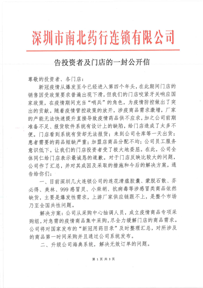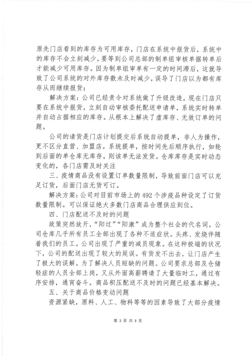 新冠疫情从爆发至今已经进入第四个年头,在此期间门店的销售因受政策要求普遍出现下滑,但我们的门店咬紧牙关响应国家政策,在疫情期间充当“哨兵”的角色,为疫情防控做出了突出的贡献。随着疫情管控政策的放开,涉疫商品需求激增,厂家的产能无法快速提升直接导致疫情药品供不应求,加之公司前期准备不足、报货软件系统有设计上的缺陷,给门店造成了太多不便。门店看到系统有货却无法报货;来到公司仓库等一天出货;患者需要的药品短缺严重;加盟店商品分配不均;公司员工服务意识低下。让我们的门店投资者受了极大地委屈。在此,公司全体同仁给门店表示最诚恳的道歉。对于门店反映比较大的问题,公司作了汇总,并对其成因及采取的措施和今后的解决方案,通告给你们: