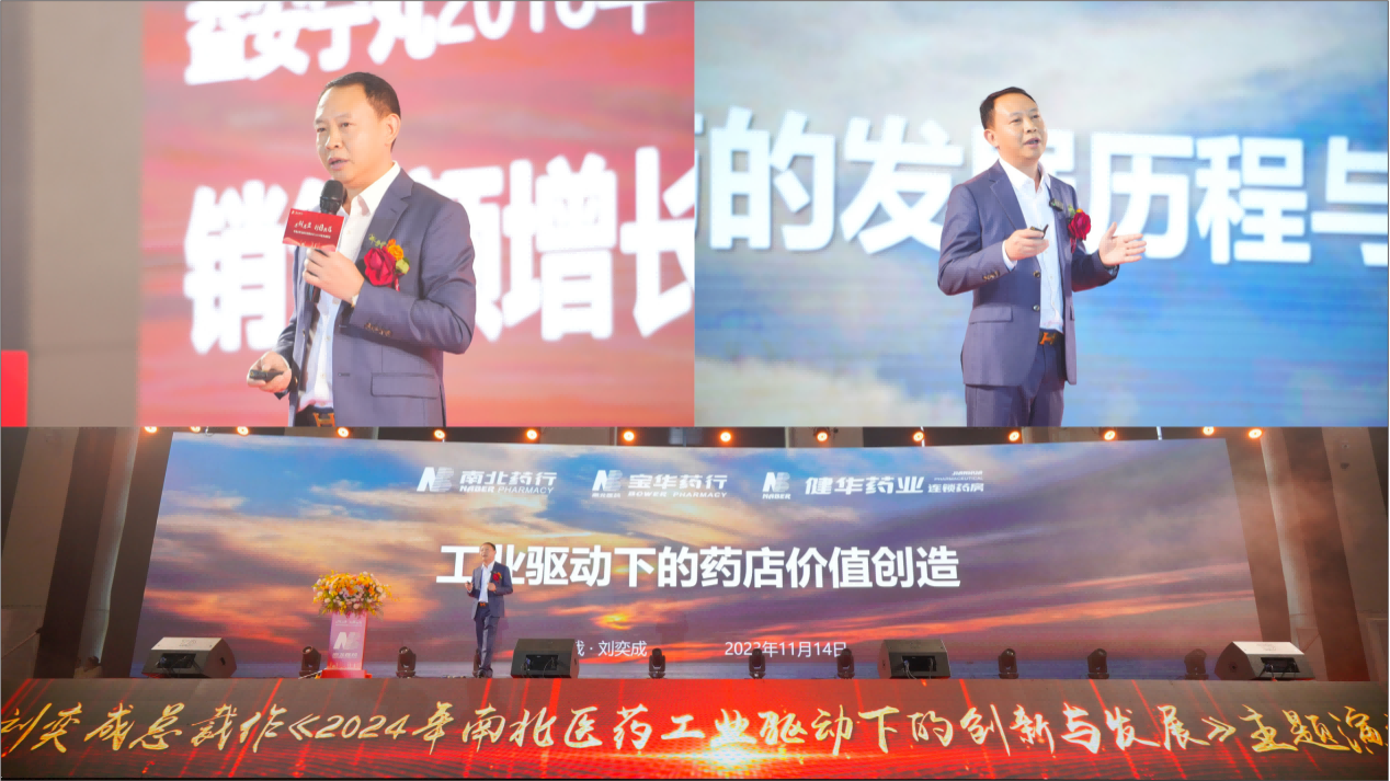 在展销会下半场,即连锁公司年终总结答谢晚宴上,深圳市南北医药有限公司总裁刘奕成先生作了《工业驱动下的药店价值创造》主题演讲,就关于医药电商兴起和互联网经济冲击下的实体药店,如何与工业品牌探索新合作模式以打破当下困境的问题,与现场嘉宾进行了深入的交流。